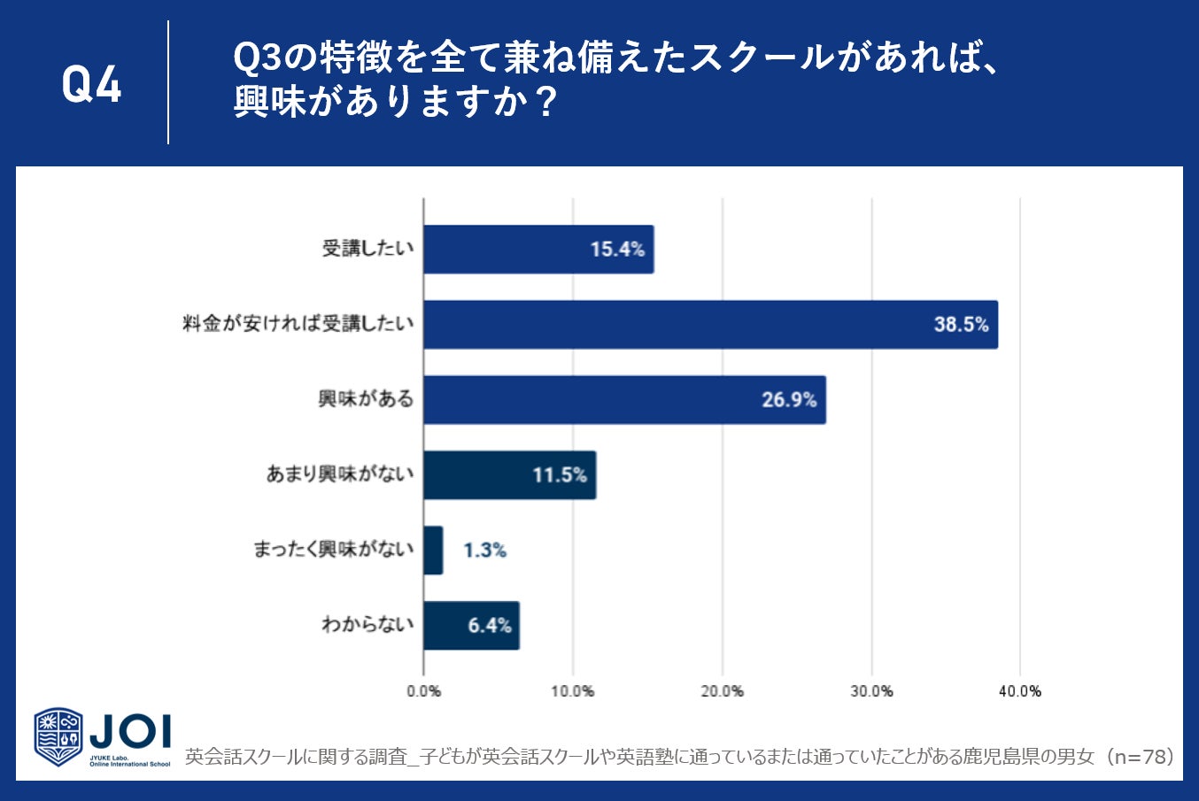 Q4で「Q3の特徴を全て兼ね備えたスクールがあれば、興味がありますか?」と質問したところ、鹿児島県では15.4%が受講を希望し、38.5%は料金が手頃であれば受講したいと考えています。さらに、26.9%は興味を示していると回答しました。多くの人がこのような特徴を持つスクールに一定の興味を示していることが分かります。