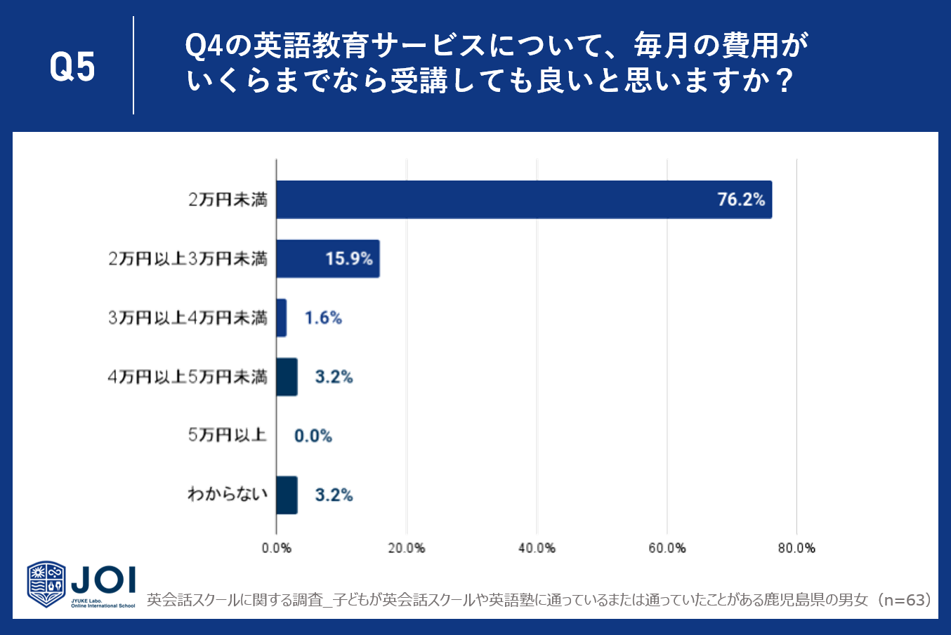 Q4で「受講したい」「料金が安ければ受講したい」「興味がある」と回答した人に、Q5で、「Q4の英語教育サービスについて、毎月の費用がいくらまでなら受講しても良いと思いますか?」と質問したところ、最も多い76.2%の回答者は2万円未満が適切と感じています。15.9%は2万円以上3万円未満、1.6%は3万円以上4万円未満と答えました。対照的に、4万円以上の費用を考える回答者は極少数で、4万円以上5万円未満が3.2%、5万円以上が0.0%でした。これにより、鹿児島県では多くの人が3万円未満の価格帯を望んでいることが明らかとなりました。