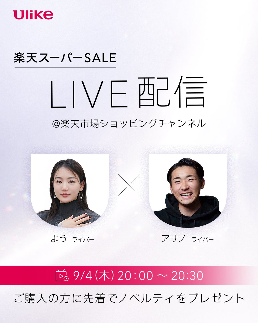 9月4日(木)20時00分~20時30分に、楽天市場ショッピングチャンネルにてライブ配信を実施いたします。本ライブでは、Ulike製品の特長や使い方をわかりやすく解説しながら、その魅力についてじっくりご紹介いたします。さらに、配信中にライブクーポンをご利用のうえ商品ご購入の方限定で、スペシャルなプレゼントをご用意。お得に楽しめる特別な機会となっておりますのでぜひこのタイミングをお見逃しなくご参加ください。