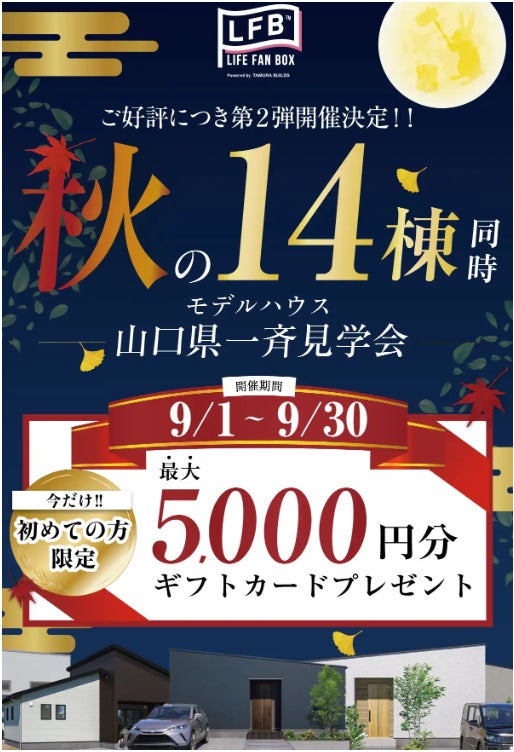 株式会社田村ビルズ(本社:山口県山口市黒川 代表:田村 伊幸)が手掛ける住宅ブランド「LIFE FAN BOX=LFB」。そのLFB新築建売住宅を14棟同時に見ることができる秋のイベントを開催中です。「気軽にモデルハウスをいくつか見学したいけど時間がない…」「家づくりなにから始めたらいいの?」とお悩みの皆さんにおすすめです。今回のイベントでは、建売住宅を探している方だけでなく、注文住宅・土地探し・間取り・住宅ローンについてなど、家づくりに関する相談にも幅広くご対応させていただきます。また、山口県内一斉見学会となっておりますので、理想の住宅や好立地の物件などに出会えるチャンスです。ぜひお気軽にお越しください。