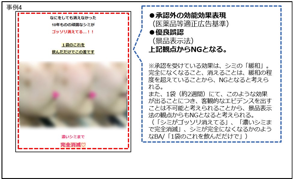 例4:しみに関する商材において、シミが消えた、シミが消滅、シミが無かったように、シミの洗剤/漂白剤、画像との組み合わせでシミがキレイになるような表現。
