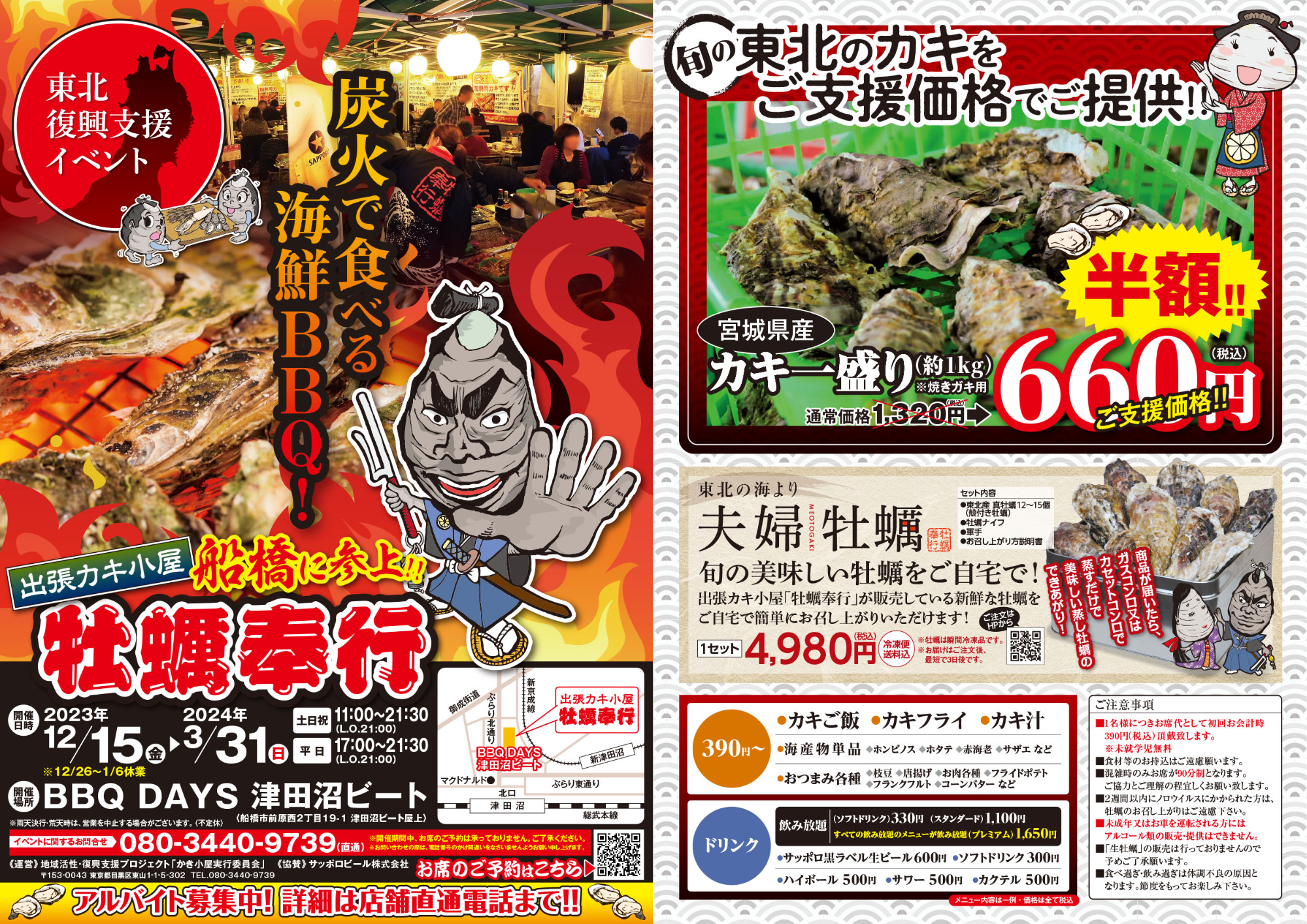 震災後不振に悩まされた宮城県の主力産業である養殖業者支援を目的とした『かき小屋実行委員会』。今回は<BBQDAYS 津田沼ビート屋上>駐車場での限定開催。自分で焼くBBQスタイルの特設会場で、地域活性化と復興支援を推進。