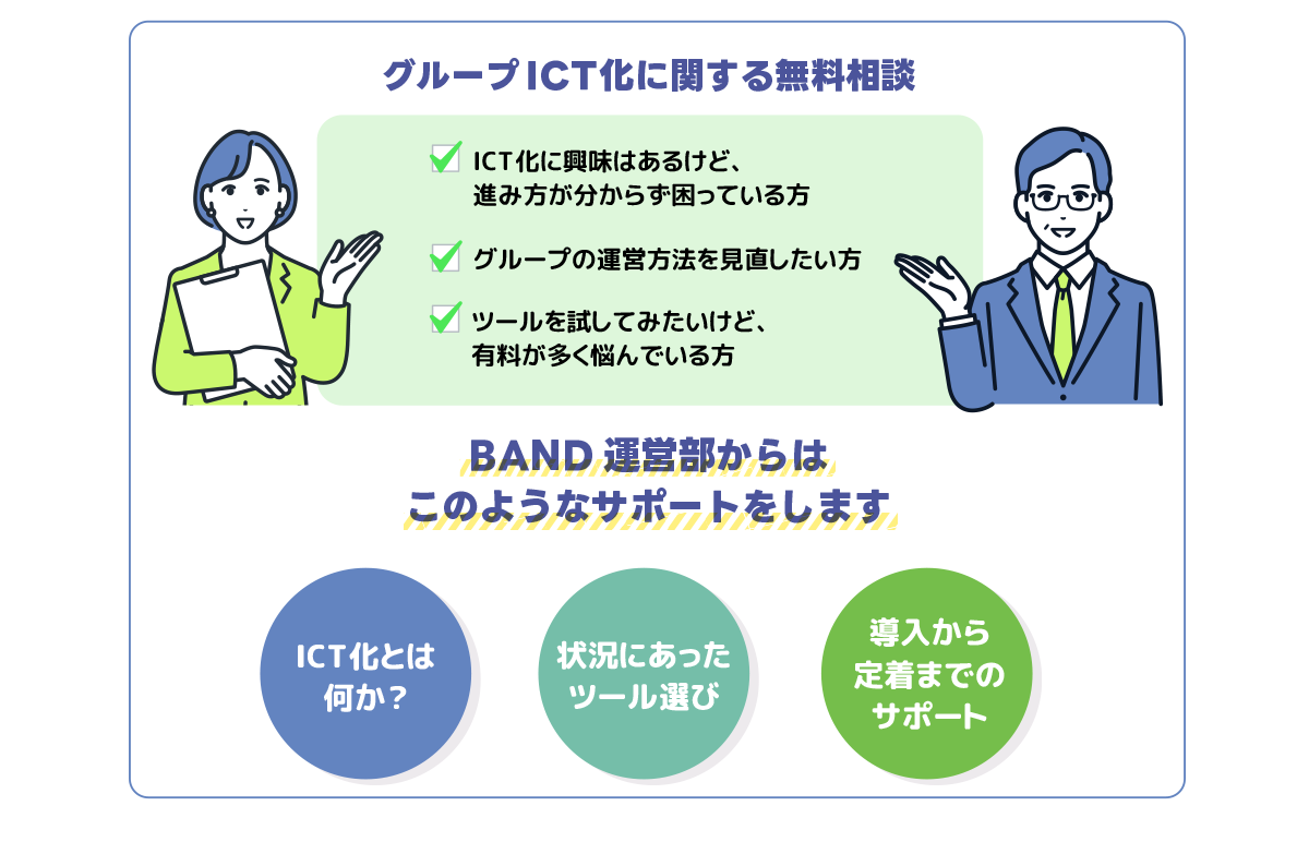 「私たちのグループに合ったICT化の進め方は何ですか?」といった疑問に対し、経験豊富なBAND運営部のスタッフが無料で相談に乗ります。ICT化に興味があるが進め方が分からない方、グループの運営方法を見直したい方、ツールを試したいが有料のものが多く悩んでいる方はぜひご相談ください。