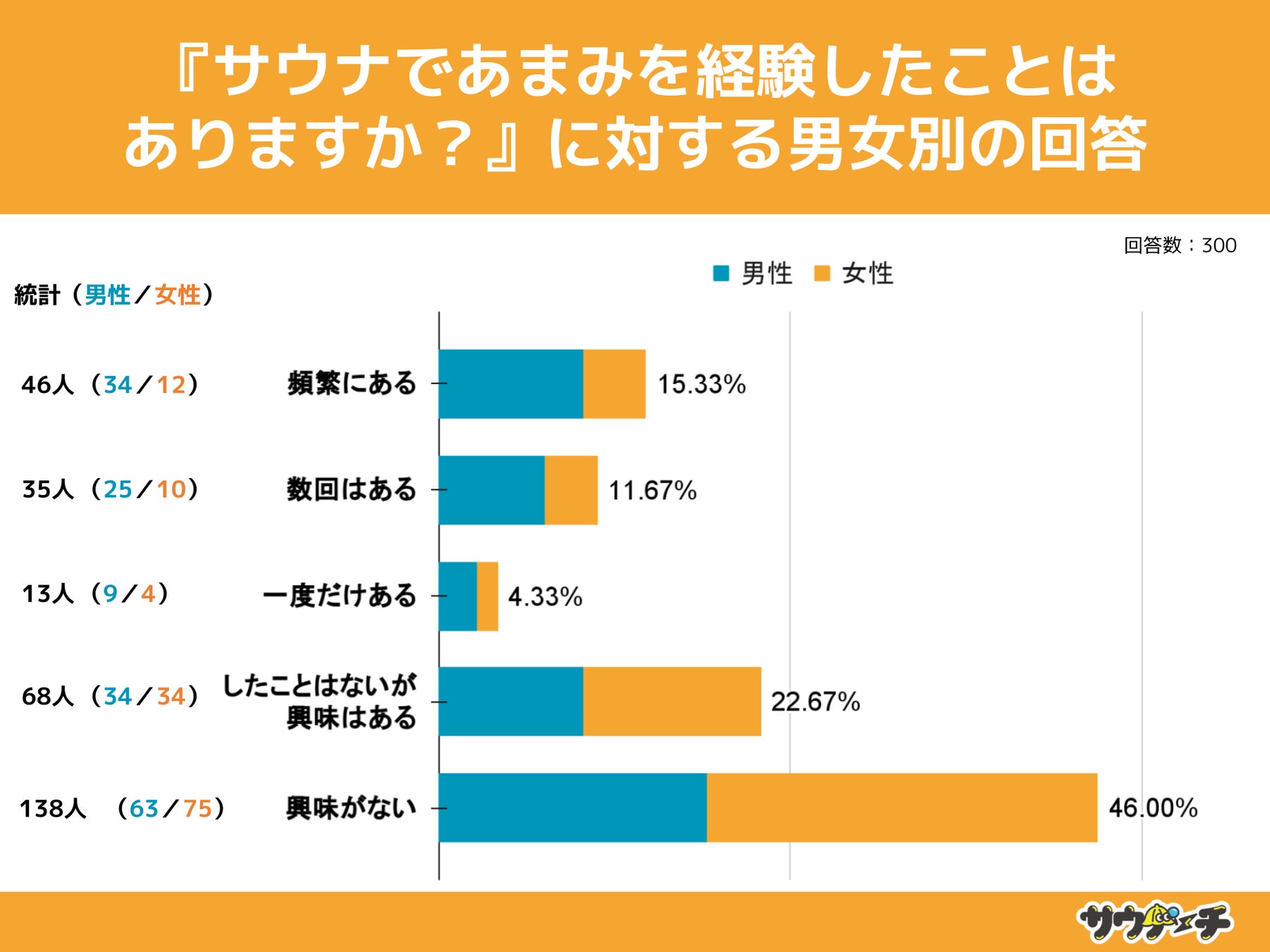 10代〜30代男女を対象とした『サウナであまみを経験したことはありますか?』というアンケートで、最も多かった回答は「興味がない」で46%でした。