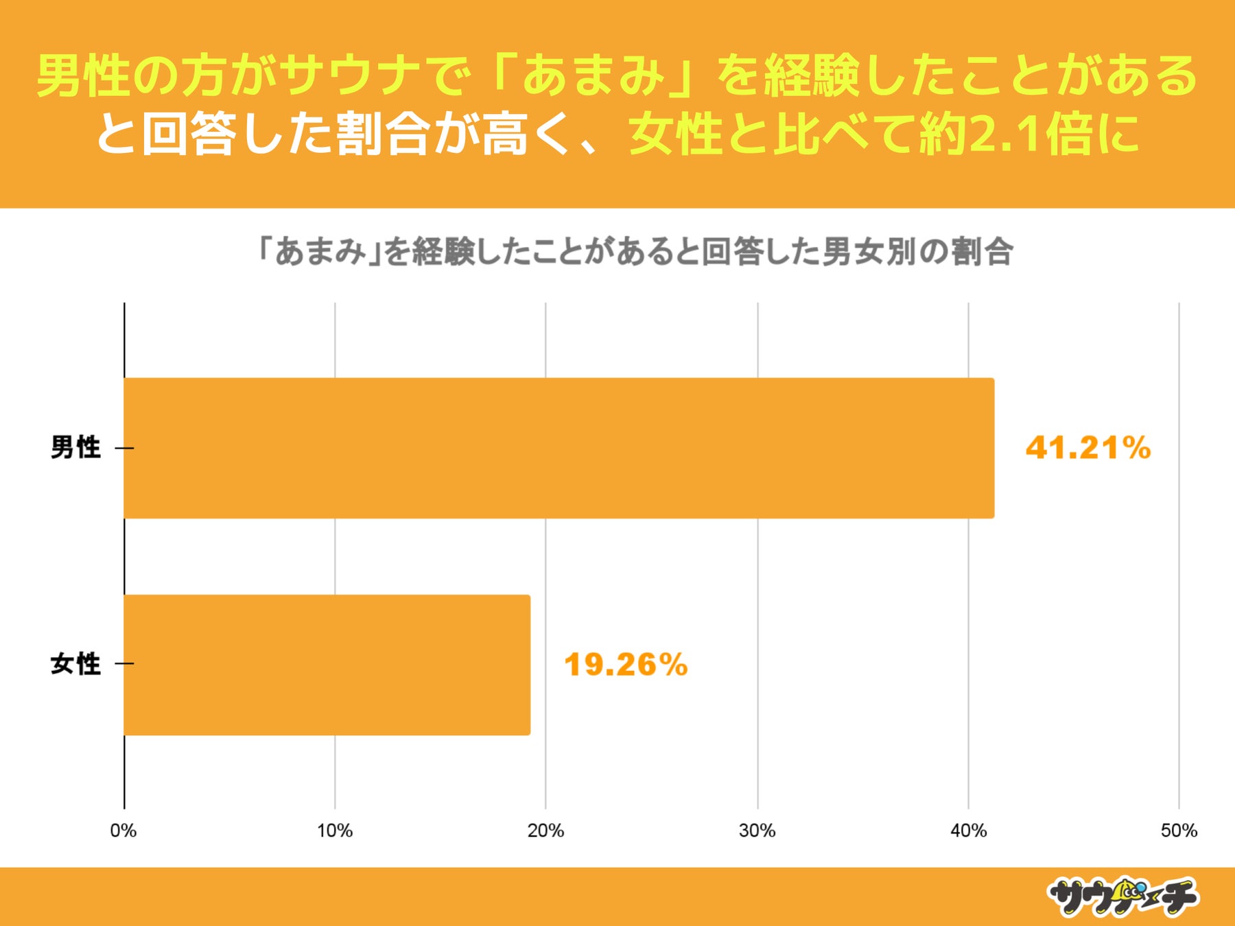サウナで「あまみ」を経験したことがあると回答した割合を男女別でみてみますと、男性が41.21%、女性が19.26%と、女性より男性の方が2.1倍高い結果となりました。