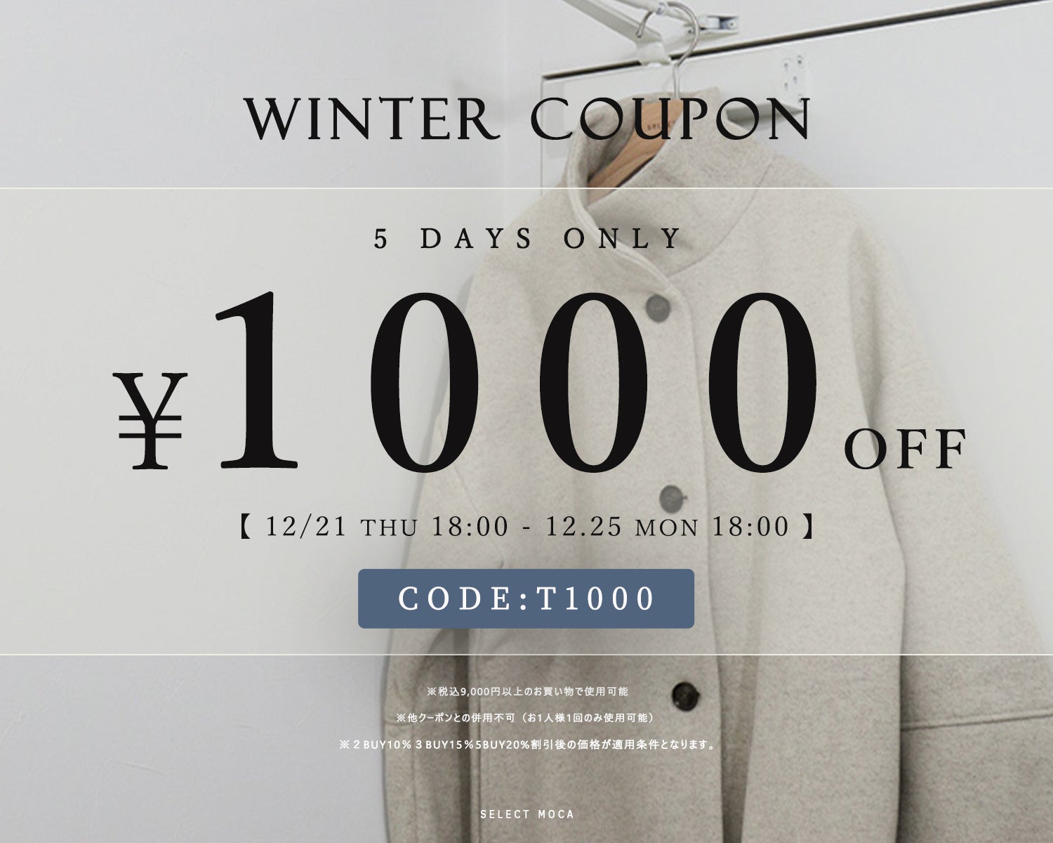 12/21(木)18:00~12/25(月)18:00までの期間中、税込9,000円以上お買い物していただいたお客様に1000円OFFクーポンをプレゼントさせていただきます。
