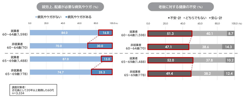 4. 60代前半・後半とも、「就労するにあたって配慮が必要な病気やケガ(後遺症を含む)はない」が85%前後。非就業者は、「病気・ケガがある人」が就業者よりも10ポイント以上多く、健康状態の悪さが非就業に繋がっている。「自分の健康」に対する不安を持つ人は、60代前半・後半ともに約半数で、就業者のほうが数ポイント多い。健康不安軽減・解消のために働く人がいると思われる。