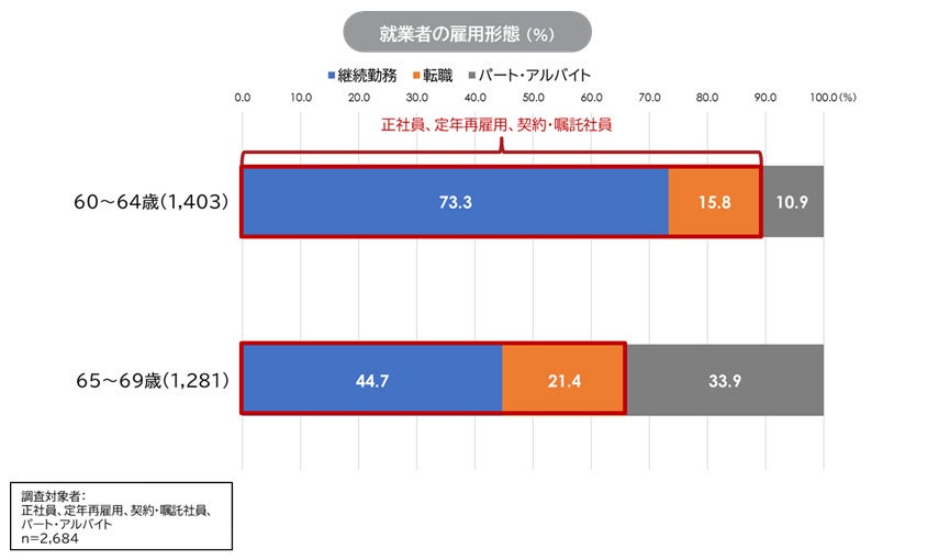 ■正社員として20年以上勤務した60代前半の就業率は95.8%、60代後半の就労率は89.3%であり、同年代全般を対象にした総務省「労働力調査」(2023年)の74.0%、52.0%よりも著しく高い。