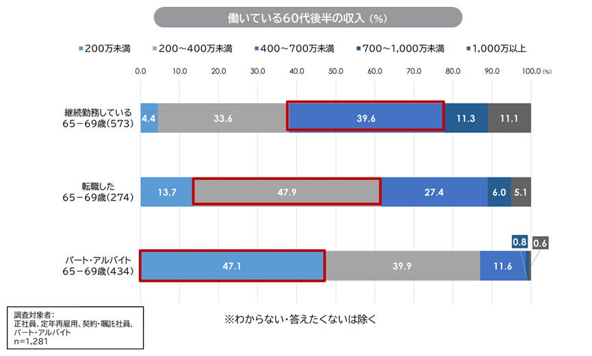 60代後半の収入は、継続勤務者「400~700万円未満」、転職者「200~400万円未満」、パート・アルバイト「200万円未満」と、ボリュームゾーンは60代前半と同様の結果。継続勤務者・転職者ともに、60代前半と比べて収入が大きく下がっているわけではない。パート・アルバイトはむしろ高収入の人が増えている。