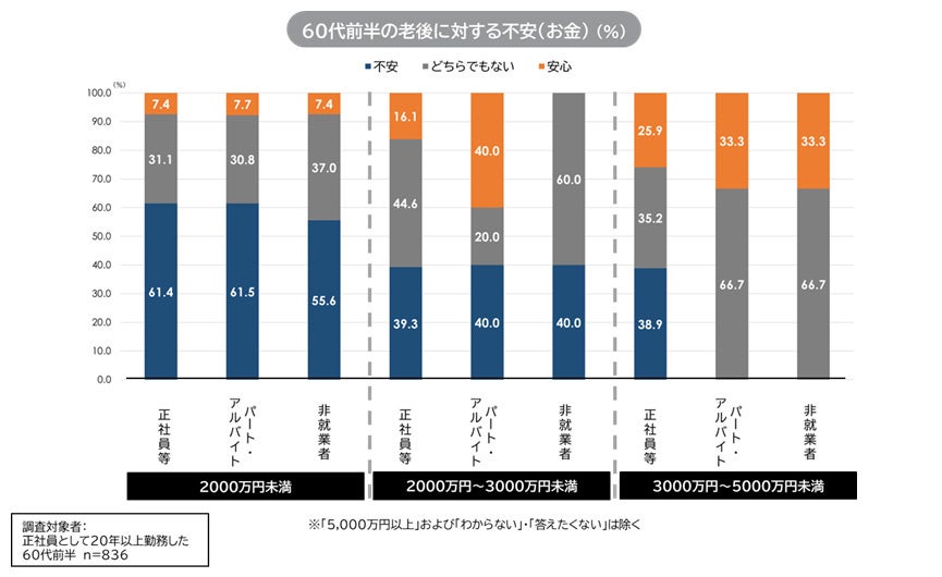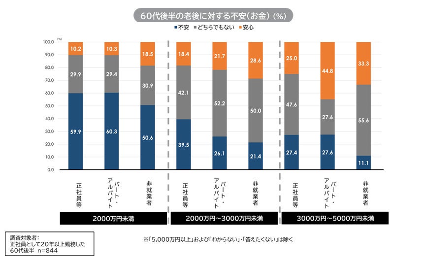 60代後半で純金融資産保有額「2000万円未満」は、「2000万円~3000万円未満」にくらべて「不安がある」人が約20~30ポイント前後増える。60代前半と異なり、60代後半では「3000万円~5000万円未満」であっても、正社員等とパート・アルバイトでは4分の1強、非就業者では約1割が「不安がある」と回答。60代前半以上に、60代後半は正社員よりもパート・アルバイト、さらには非就業者のほうが、お金と仕事の関係については楽観的。