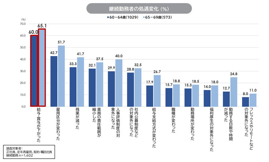 8. 60代の処遇の変化を見ると、継続勤務者で「給与・賞与が下がった」人は60代前半で60.0%、60代後半で65.1%。裏返すと、60代前半の40%、60代後半の34.9%は給与・賞与が下がっていない。他の項目では、60代後半の「雇用区分が変わった」が51.7%と半数を超えているが、その他の項目はいずれも、60代前半・後半とも、処遇が変更された人は半数以下にとどまる。