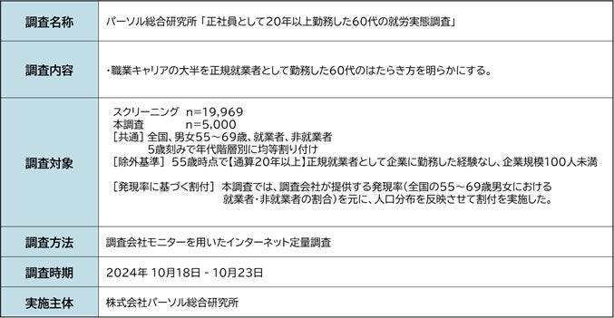 株式会社パーソル総合研究所(本社:東京都江東区、代表取締役社長:萱野博行)は、「正社員として20年以上勤務した60代の就労実態調査」の結果を発表いたします。