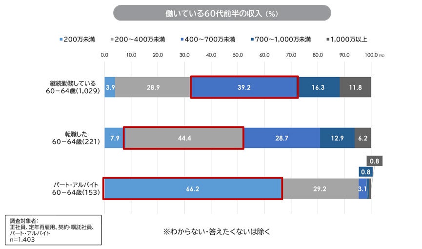 2. 60代前半の収入は、継続勤務では「400~700万円未満」、転職は「200~400万円未満」、パート・アルバイトは「200万円未満」がボリュームゾーン。継続勤務者は、転職者よりも収入が高い傾向がある。