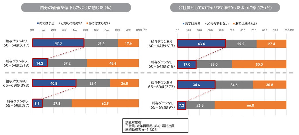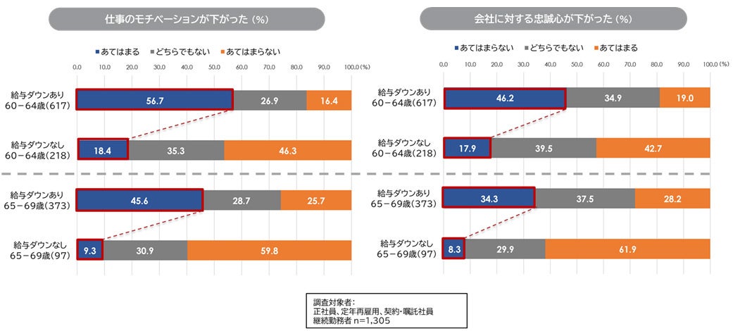 また、給与・賞与が下がった人のうち、 「仕事のモチベーションが下がった」では、60代前半が5割超、60代後半で4割超。「会社に対する忠誠心が下がった」では、60代前半が4割超、60代後半で3割超。前述の「自分の価値低下」「キャリアが終わった」と同じく、給与ダウンしていない人の数倍であり、給与ダウンの有無でモチベーションと忠誠心が大きく異なる。