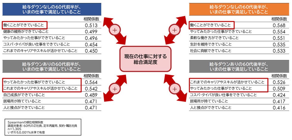 60代前半・後半とも、「給与ダウンなし」の人は「働くことができていること」と総合満足度との相関が高いのに対し、「給与ダウンあり」の人は「やってみたかった仕事ができていること」「これまでのキャリアやスキルが活かせていること」と仕事内容と総合満足度との相関が高い。「給与ダウンあり」の人は金銭処遇以外に満足を見出している。