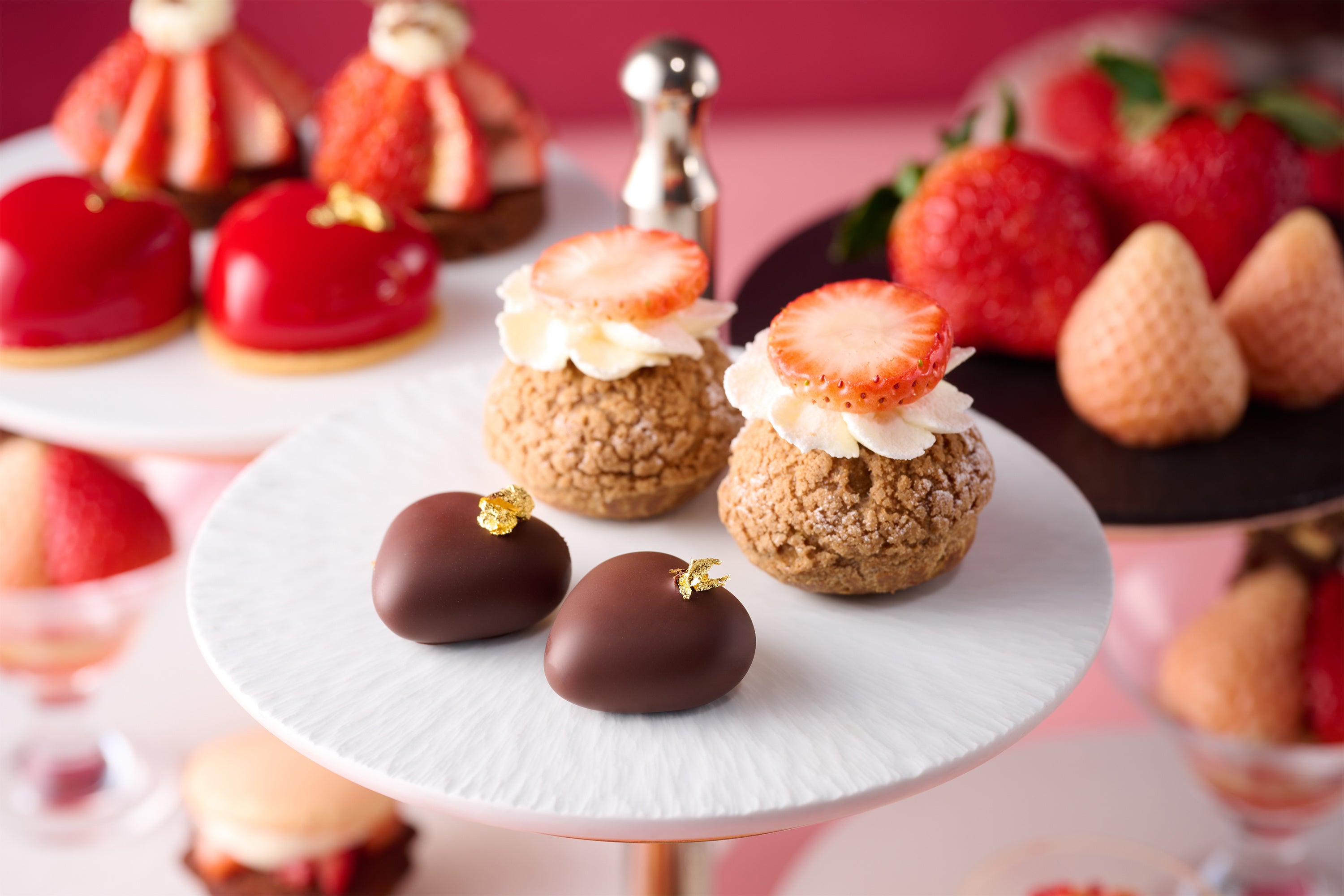 いちごらしい甘酸っぱさが魅力の静岡県産「紅ほっぺ」の風味を生かした赤いハート型のビターチョコレートムースや、華やかな香りと強い甘みが特長の埼玉県産「べにたま」と生チョコレートを合わせたショコラシューなど、いちごとチョコレートそれぞれの個性を引き立てたラインアップで、食べ比べをお楽しみいただけます。