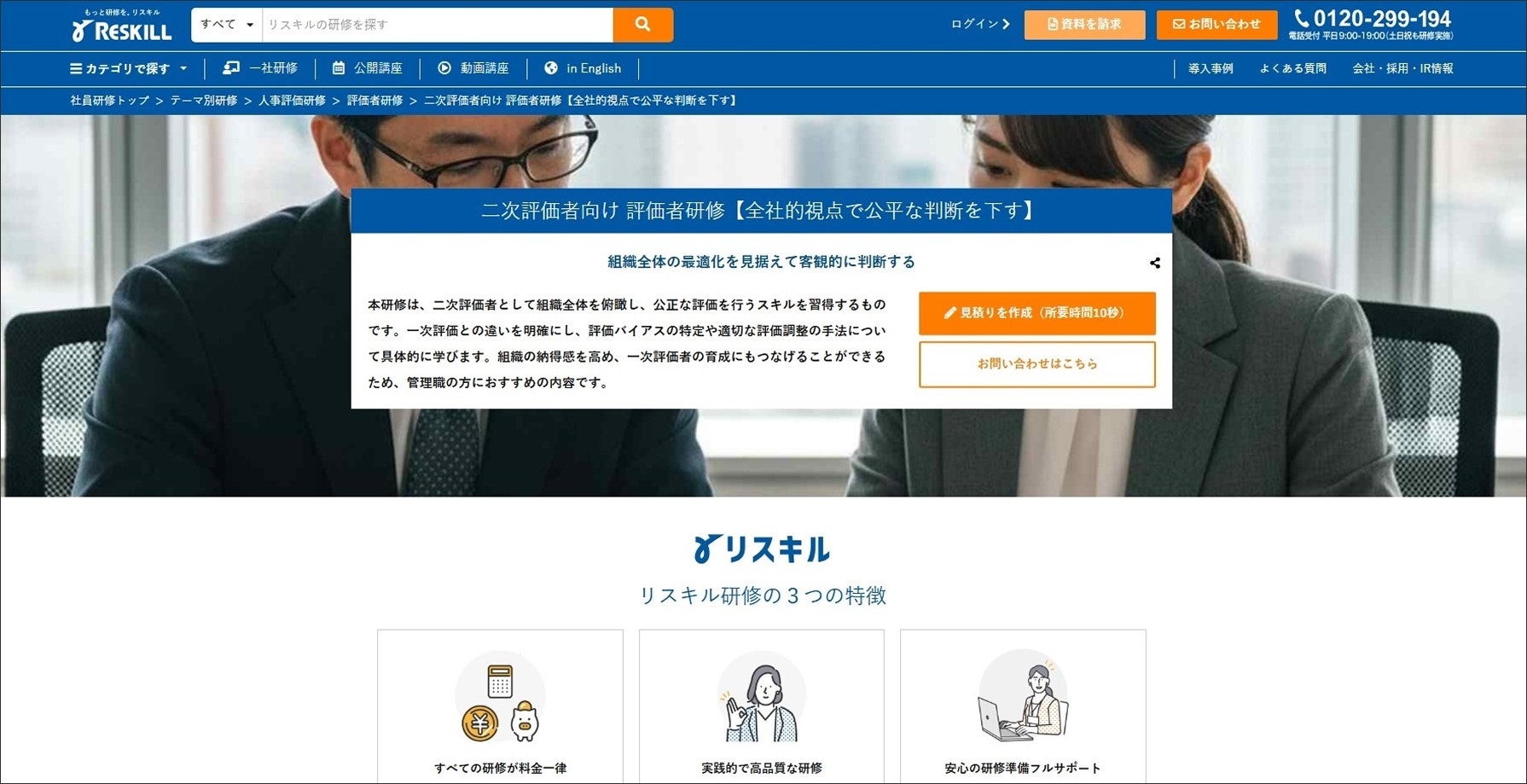 株式会社リスキルは、多種多様なニーズに対応する研修プログラムを提供しています。評価者研修を含め、ビジネス研修が料金一律の明瞭な価格体系が特徴です。研修日の運用だけでなく、教材の郵送といった準備段階からのフルサポート体制を整えています。オンライン研修にも対応しており、企業の教育環境整備を柔軟に支援します。