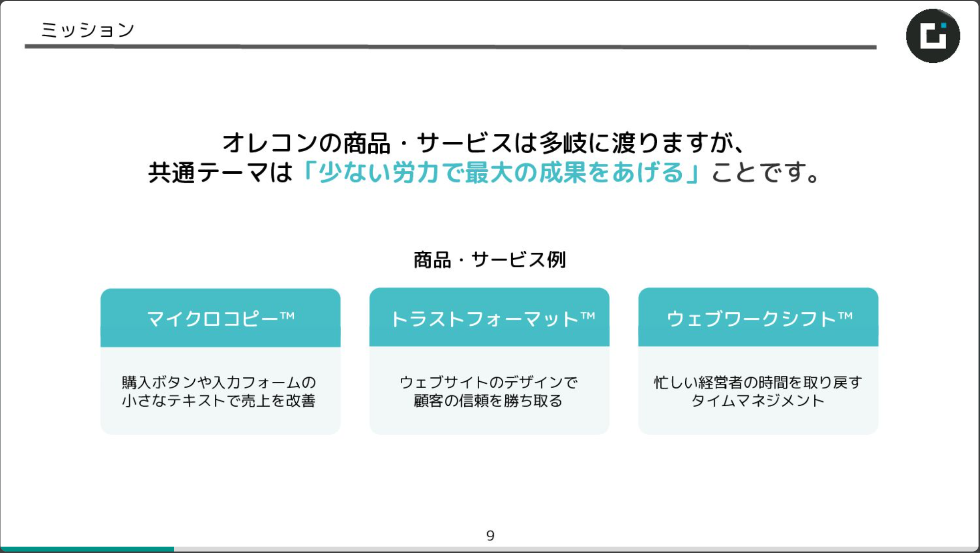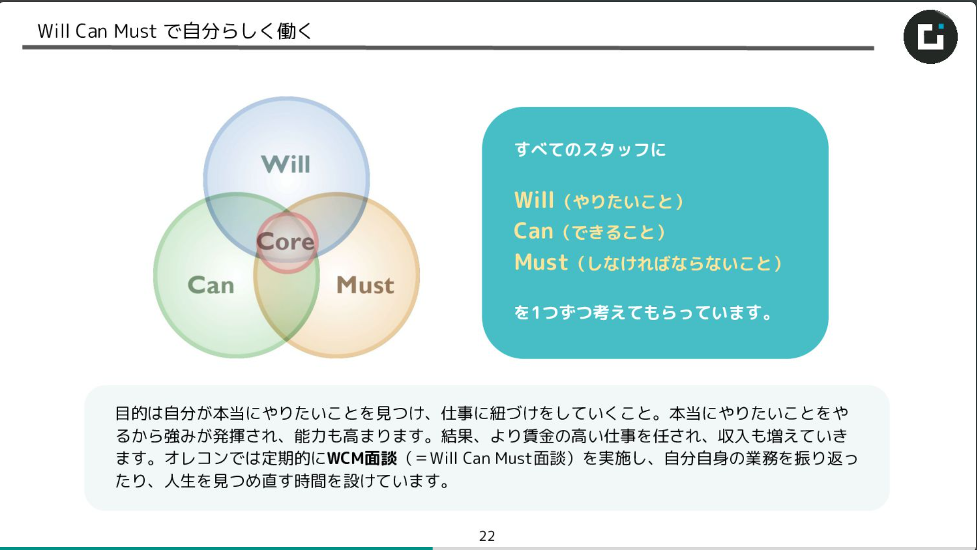 「会社説明資料」は、オレコンがどのような経営理念を持ち、どのような環境で成果を上げているのか、さらにはスタッフがどのような成長機会を得られるかなど、詳細かつ具体的な情報を提供します。応募者の方と企業のミスマッチや誤解を減少させ、お互いの時間とリソースを最大限に活用することを目指します。