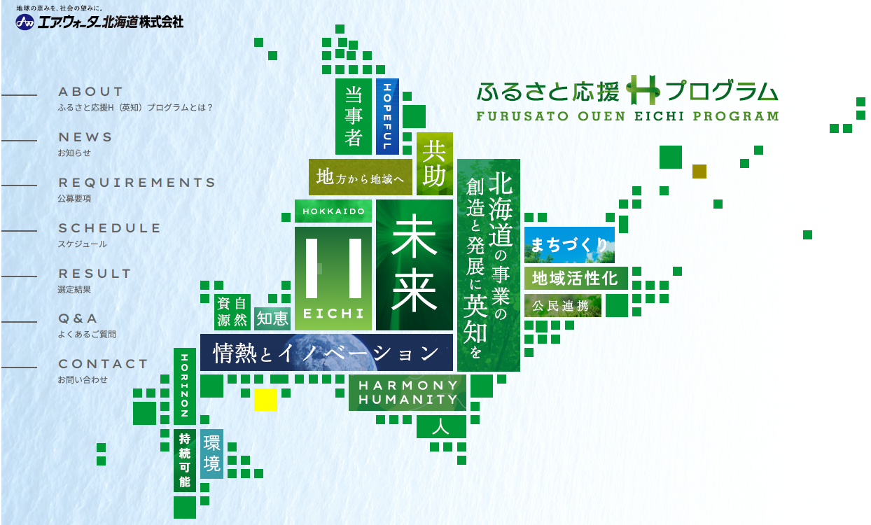 なお、本寄付支援制度「ふるさと応援H(英知)プログラム」の名称のHには、HOKKAIDO(北海道)、HOPEFUL(希望)、HUMANITY(人間性)、HARMONY(調和)、HORIZON(地平線)の意と、エア・ウォーターグループの経営理念「創業者精神をもって 空気、水、そして地球に関わる事業の創造と発展に『英知』を結集する」が込められています。