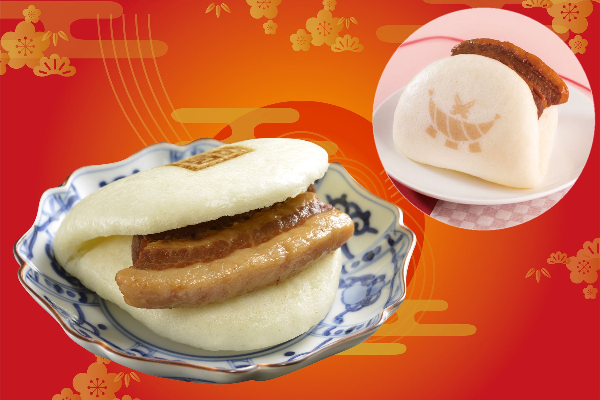 (写真左)ふわっとした生地に角煮を挟み込んだ長崎名物。(写真右)古くより縁結びの地として知られる「島根県出雲」と特別コラボ。高砂醤油本店のこいくち醤油「出雲醸(いずもかもす)」を使用したタレで角煮を煮込んでいます。