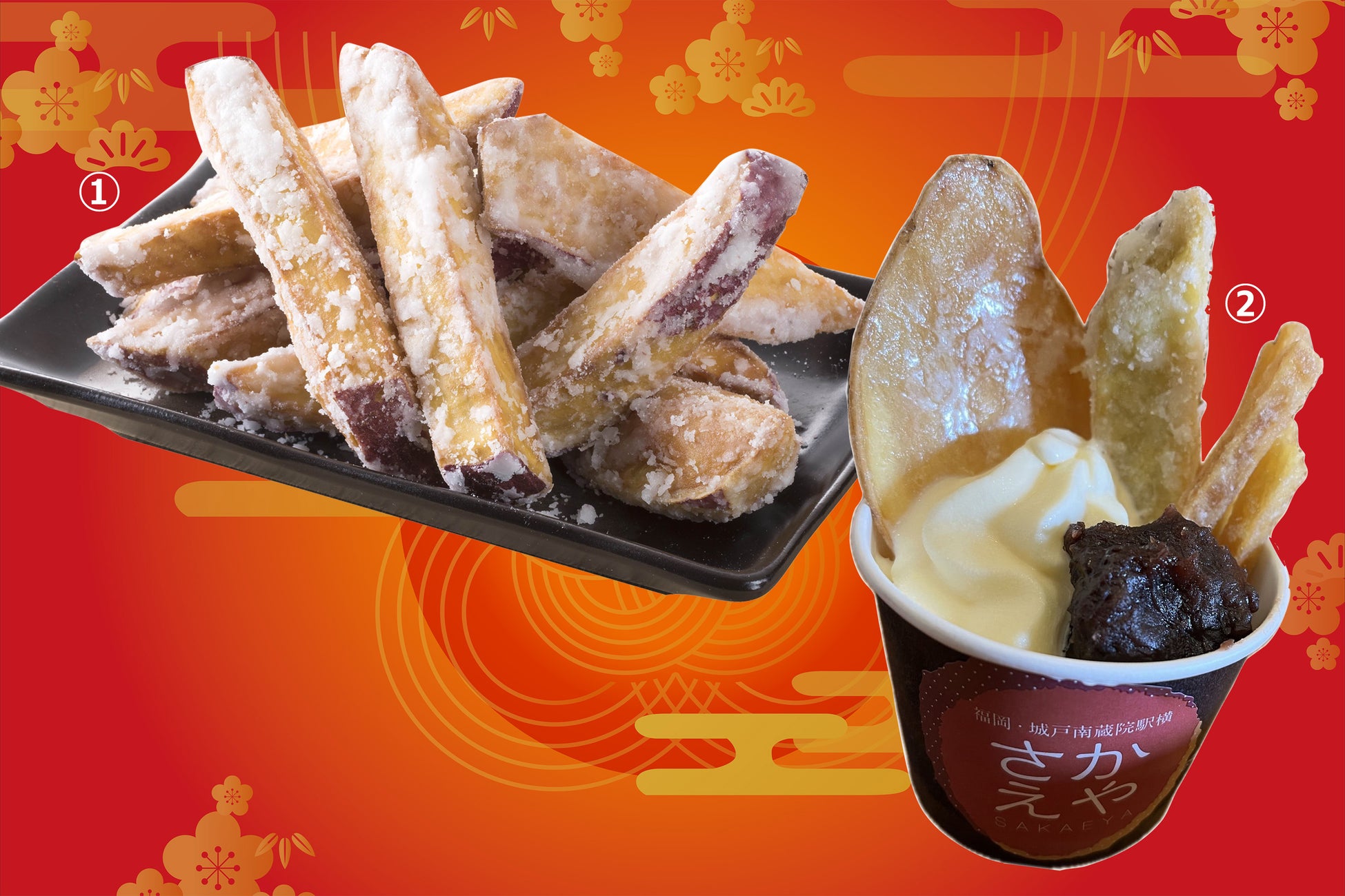 九州産さつまいもを使った「ソフトかりんとう」や、冷たいアイスに「おみやけんぴ」やあんこをトッピングした和風パフェ。