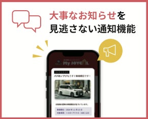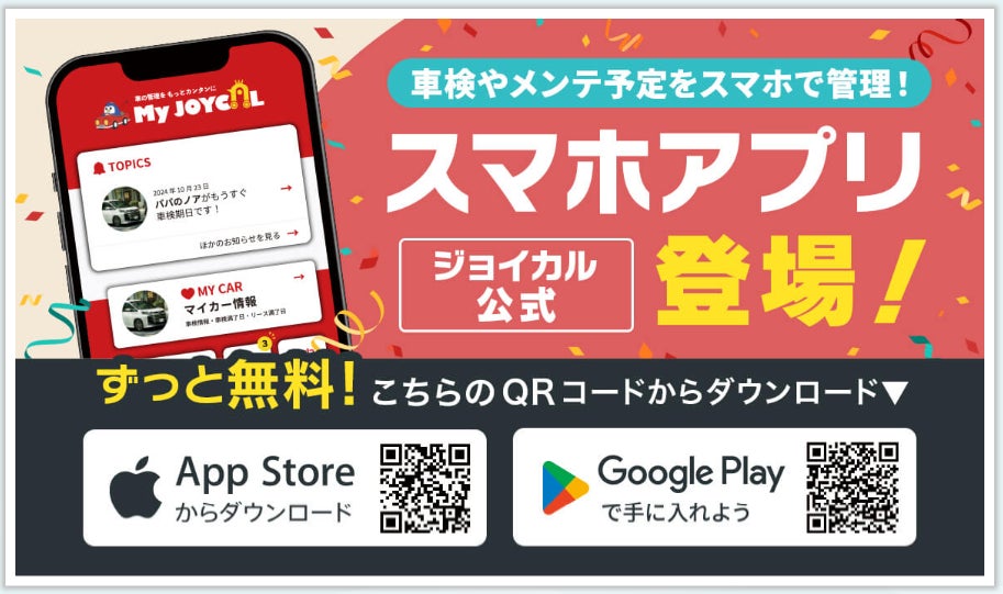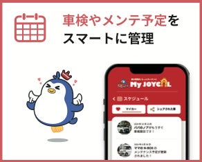 また、重要なメンテナンス時期が近づくと自動で通知してくれる機能も搭載。車検切れや必要なメンテナンスの見落としを防ぎ、大切な車を安全に長く楽しめるようサポートいたします。「My JOYCAL」は、App StoreとGoogle Playでどなたでも無料でダウンロードいただけます。ジョイカルは、「My JOYCAL」を通じて、より多くの方々の楽しく安全なカーライフをサポートしてまいります。