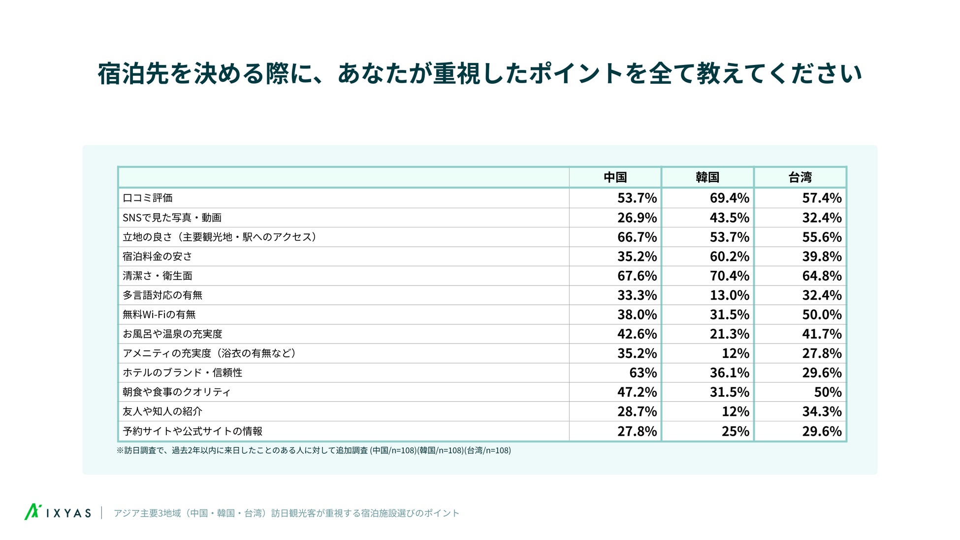 韓国は 価格(60.2%) を最も重視し、コスパを重視。中国は 立地(66.7%) を重視し、観光の利便性を優先。台湾は 食事(50.0%)と清潔さ(64.8%) を重要視する傾向がある。