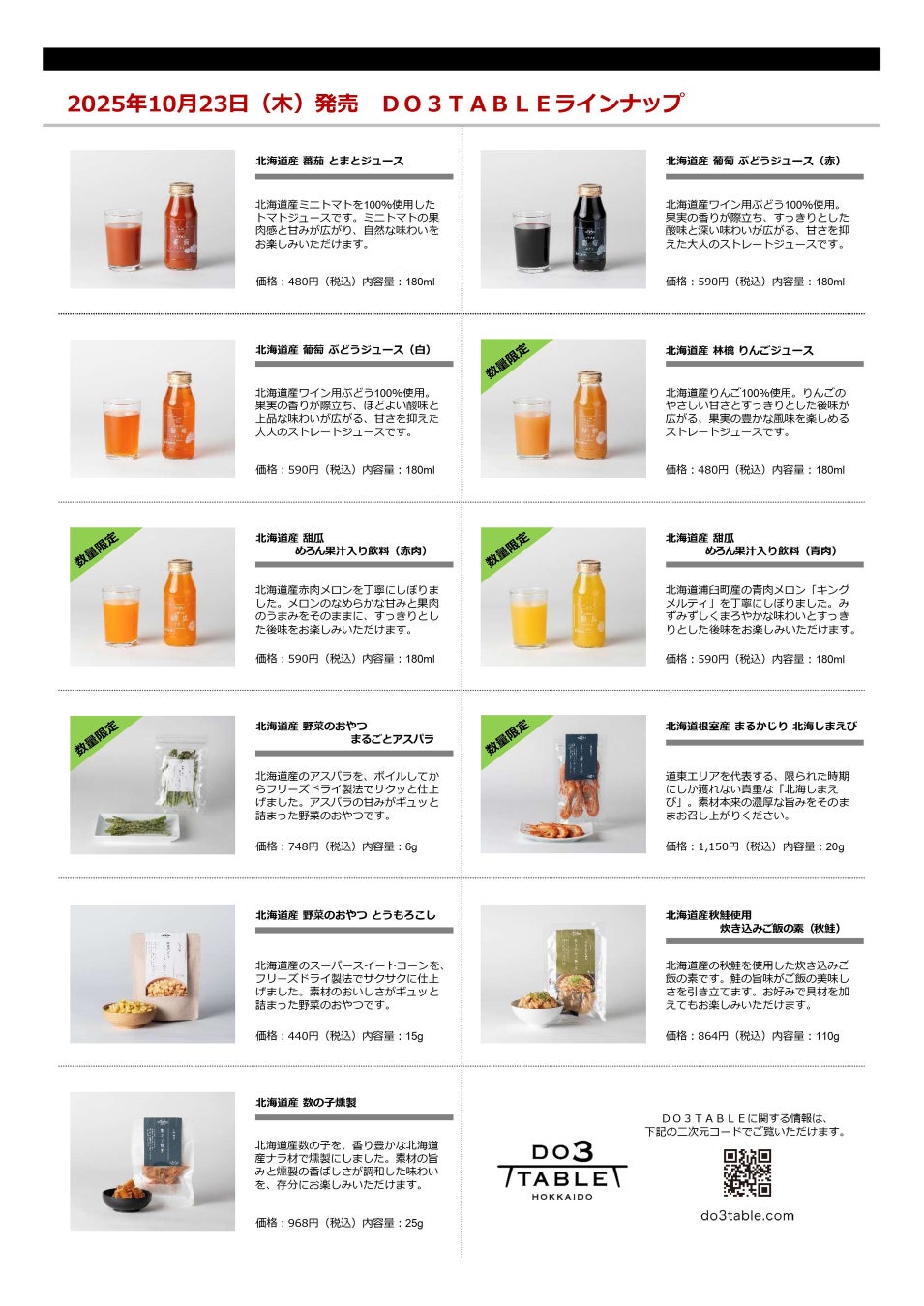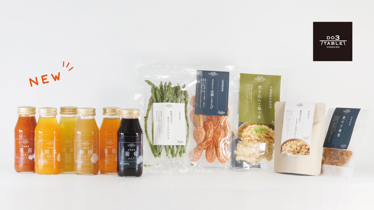 JR北海道フレッシュキヨスク株式会社(本社:北海道札幌市、代表取締役社長 戸川 達雄)は、本年10月23日(木)より、「DO3TABLE(ドーサンテーブル)」に新たな果汁飲料を加え、昨年ご好評をいただいた『北海道根室産 まるかじり北海しまえび』を含む 11 商品を発売いたします。