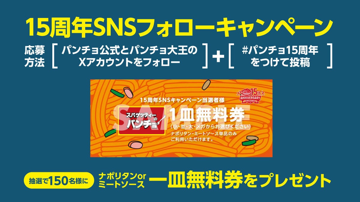 パンチョ15周年の喜びをSNSでみんなで分かち合おう! 15周年SNSフォローキャンペーンも同時開催します。パンチョ公式Xとパンチョ大王Xアカウントをフォローのうえ「#パンチョ15周年」を付けてXに投稿してください。抽選で150名様にパンチョ一皿無料券をプレゼントします。