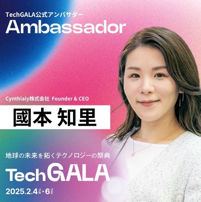 法人向けの生成AI人材育成・導入変革支援を行うCynthialy株式会社(所在地:東京都渋谷区、代表取締役:國本知里、以下Cynthialy)は国内外から5000名以上が集う、地球の未来を拓くテクノロジーの祭典 TechGALAにおいて、Cynthialy代表の國本がアンバサダーに就任するとともに、セッションに登壇することをお知らせいたします。