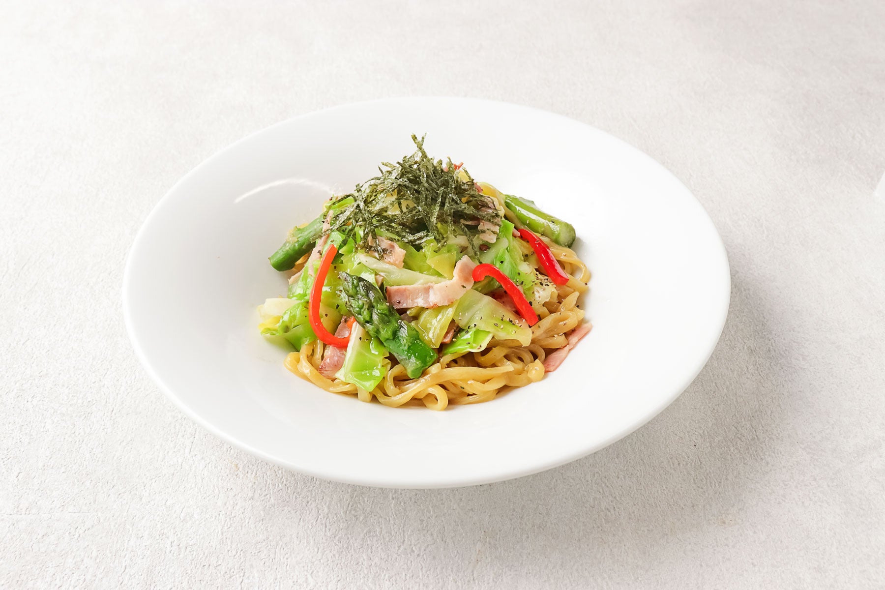 春キャベツの甘味を最大限に引き出した、ペペロンチーノ風の和え麺です。さっぱりとした塩味が、キャベツの美味しさを際立たせます。よく混ぜてからお召し上がりください。