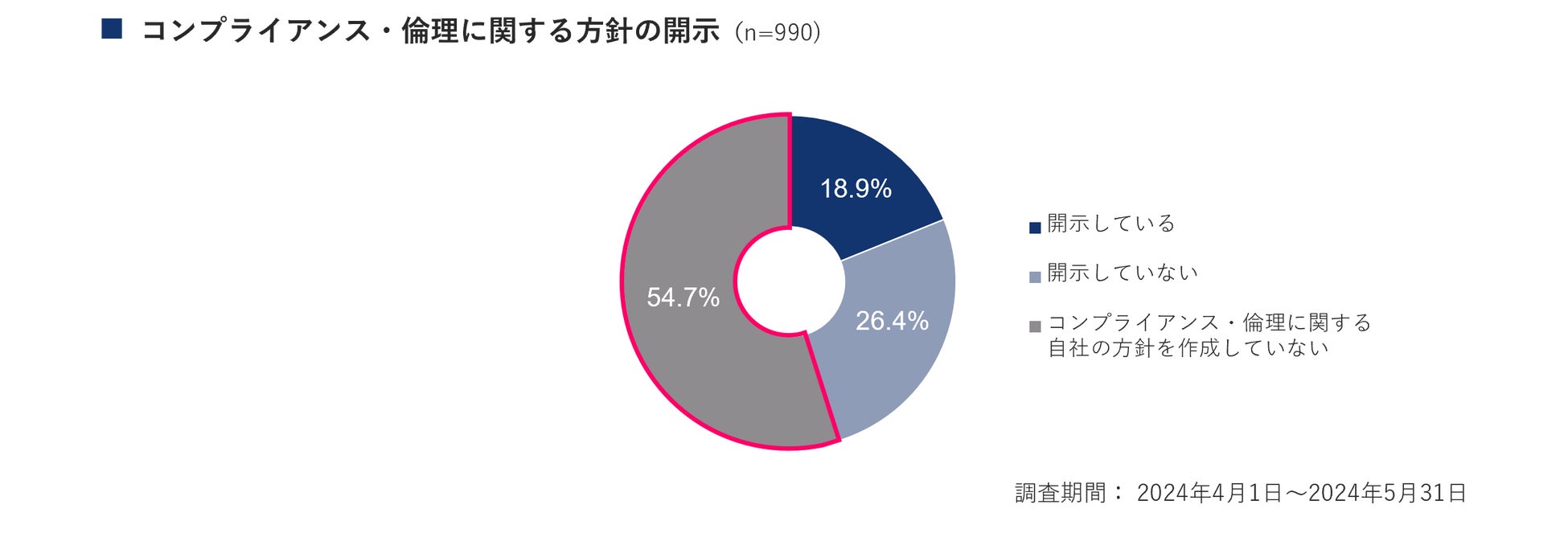 次にコンプライアンス・倫理に関する方針を従業員へ開示しているかどうかについての調査結果です。「開示している」が約2割と少ない状況であり、また、そもそも「コンプライアンス・倫理に関する自社の方針を作成していない」という回答が最も多く、54.7%だとかわかりました。コンプライアンスや倫理に関する問題が起こった際に企業の考えや方針が明確になっていないと、業員により異なったり、会社として統一性のない対応となってしまう可能性が考えられます。