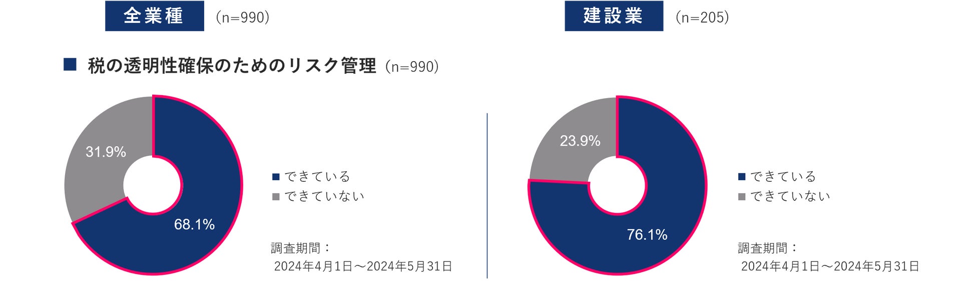 【調査結果サマリー】 ①企業の存在意義を示す経営理念を策定している企業は41.5% コンプライアンス・倫理に関する自社の方針を作成していない企業は54.7% 企業統治活動の基本的取り組みに関して、未対応や手つかずの企業の実態が明らかに ②税の透明性確保のためのリスク管理についてはできていない企業が31.9% 「不正行為に関する自社の方針を定めていない」企業は42.5% 第三者認証や認定の取得については68%の企業が一つも取得できていない結果に ③「税の透明性確保のためのリスク管理」では 全業種よりも建設業の方が「できている」との回答が多い結果に 建設業は他の業種と比べ外部の専門家を積極的に活用する企業が多い傾向が明らかに |