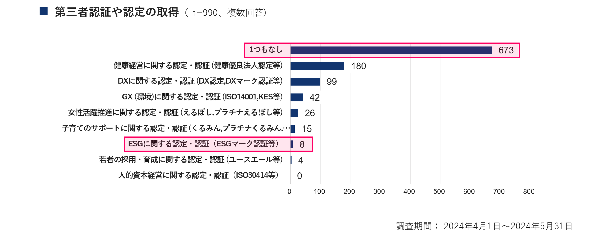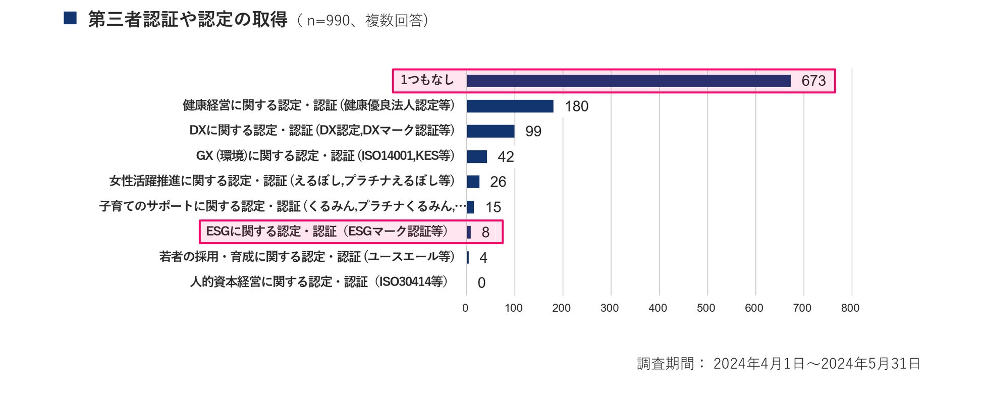 調査から各第三者認証・認定について、1つも取得できていない企業が最も多く、回答企業990社のうち673社(回答総数の68.0%)という結果でした。取得が多い第三者認証や認定については、最も多かったのが健康経営に関する認定・認証(健康優良法人認定等)で180社、続いてDXに関する認定・認証(DX認定,DXマーク認証等)が99社、 GXに関する認定・認証(ISO 14001,KES等)が42社となりました。