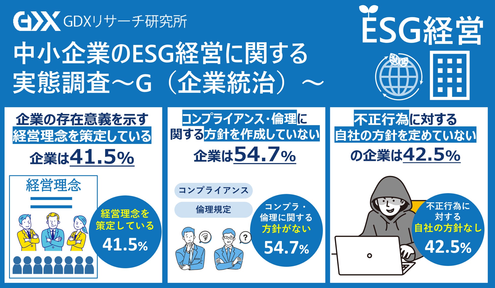 〈中小企業のESG経営に関する実態調査~G(企業統治)~〉企業の存在意義を示す経営理念を策定している企業は41.5% 54.7%の企業はコンプライアンス・倫理に関する方針を作成せず