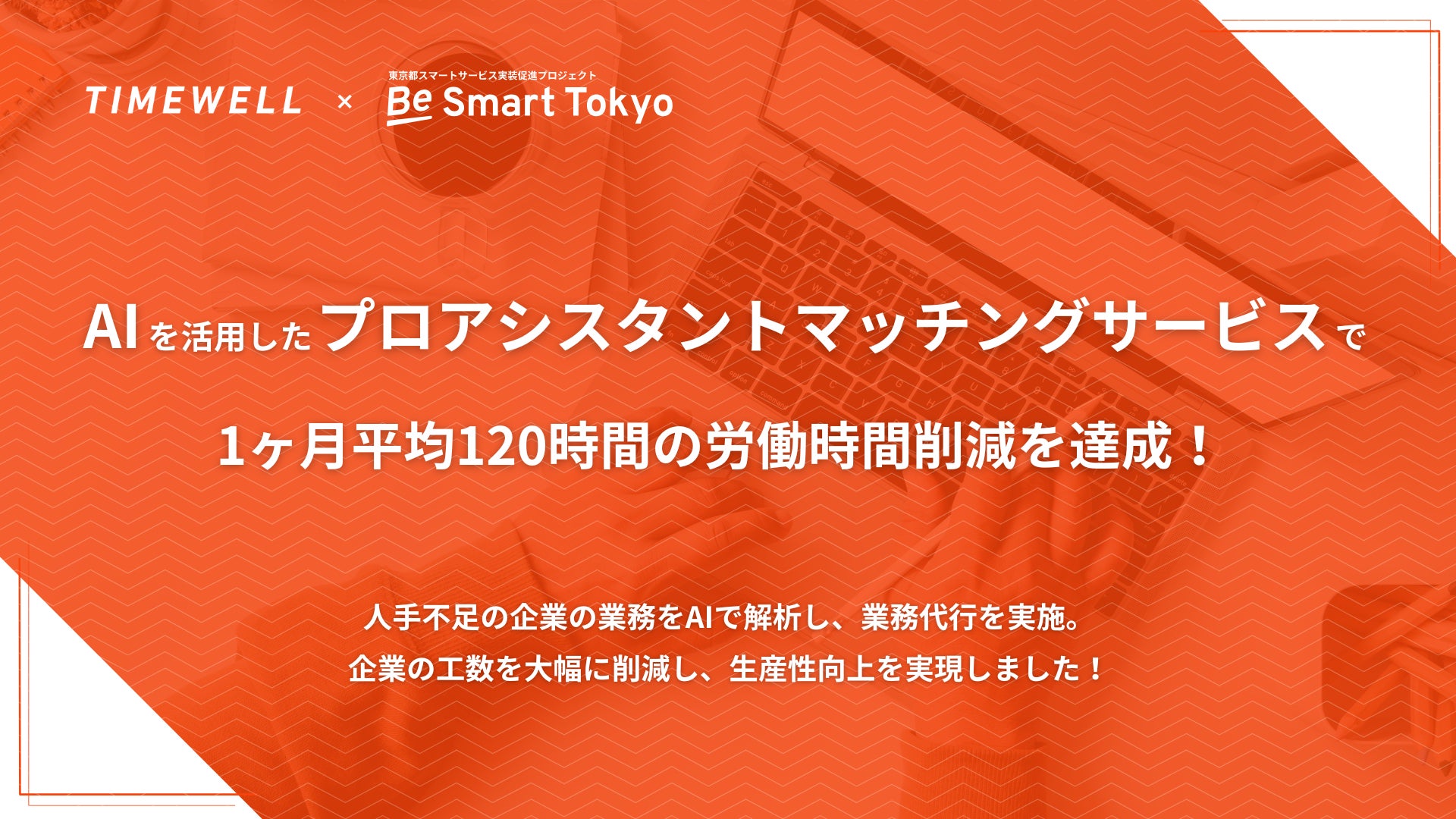 株式会社TIMEWELL(本社:神奈川県横浜市、代表取締役:濱本隆太、以下「TIMEWELL」)は、東京都の「Be Smart Tokyoプロジェクト」実装促進事業者のPlug and Play Japan株式会社に支援いただき、イベント・セールスプロフェッショナル業務コンサルティングサービス「TIMEWELL ASSISTANTS」により、都内大企業の工数を1ヶ月平均120時間削減し、生産性向上を実現したことをお知らせします。