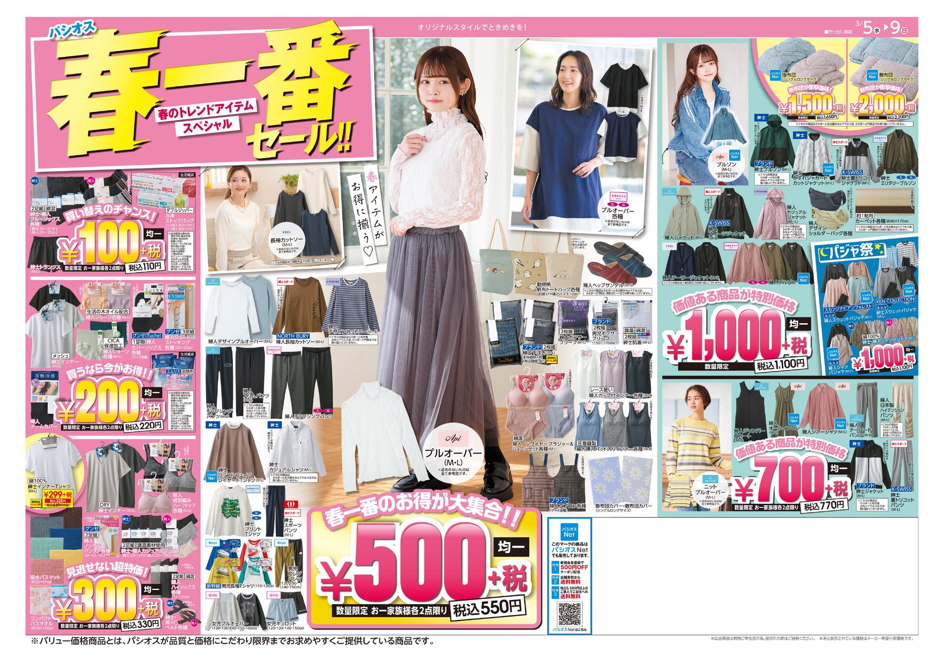 ・店舗 ※牛久駅前店は3/6(木)より実施します。 ※ららぽーと名古屋みなとアクルス店は3/8(土)より実施します。 ※相模大野駅前店・ミナノバ相模原店・白井店・宝木店・太田東矢島店は 別のチラシを実施します。 ※モリシア津田沼店は非実施です。 詳しくは「パシオスチラシ」サイトをご確認ください ・公式オンラインストア ※パシオスNetでは一部取り扱いのない商品もございます |