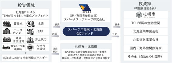 本ファンドは、TSHが掲げる8つの重点GX領域および再生可能エネルギー関連プロジェクトを中心に、北海道内のGXプロジェクトを投資対象とします。また、特区制度による補助金・税制優遇・規制緩和などを活用し、良質な投資機会を創出することで、国内外から北海道のGX産業への資金流入を促す“呼び水”となることを目指します。