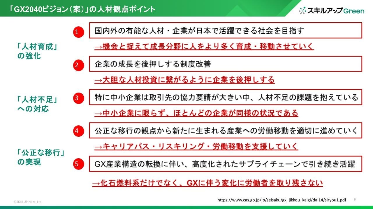 2024年12月26日に政府より発表されたGX2040ビジョン(案)において「人材育成」の強化、「人材不足」への対応、「公正な移行」の重要性が指摘されています。