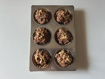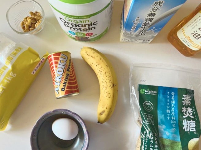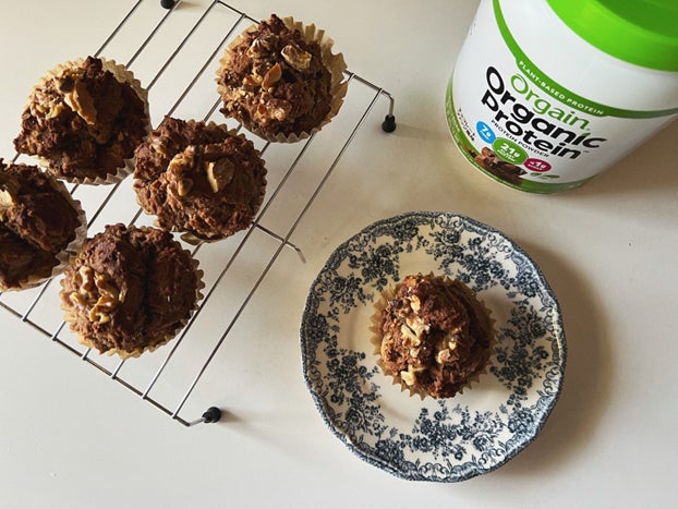 オーガニックプロテイン「Orgain(オルゲイン)」のチョコレートファッジ風味(チョコレート香料使用)を生地に練り込み、バナナとくるみを加えたマフィンは、食べ応えがあり、運動後のちょっとした栄養補給にもおすすめです。