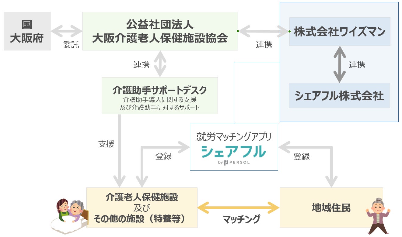 「介護助手導入支援事業」は、(公社)大阪介護老人保健施設協会と株式会社ワイズマン、シェアフル株式会社が連携を図り実施しております。対象施設としては、大阪府の介護老人保健施設、介護老人福祉施設を中心に活動を行い、就労機会を求めている地域のアクティブシニアを中心に人材を掘り起し、『介護助手』として活躍できる仕組みを提供することで、介護現場の生産性向上に貢献します。