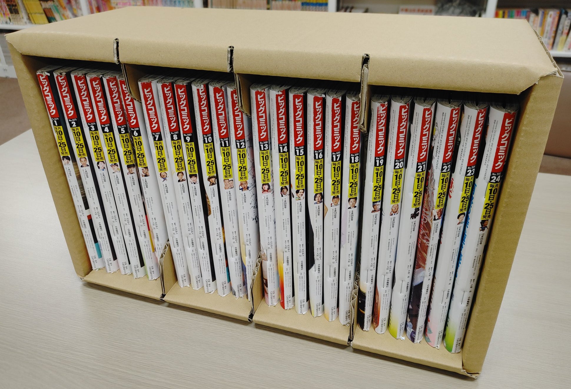 中綴じマンガ雑誌は管理・収納が難しく、図書館などで取り扱いづらい状況があります。