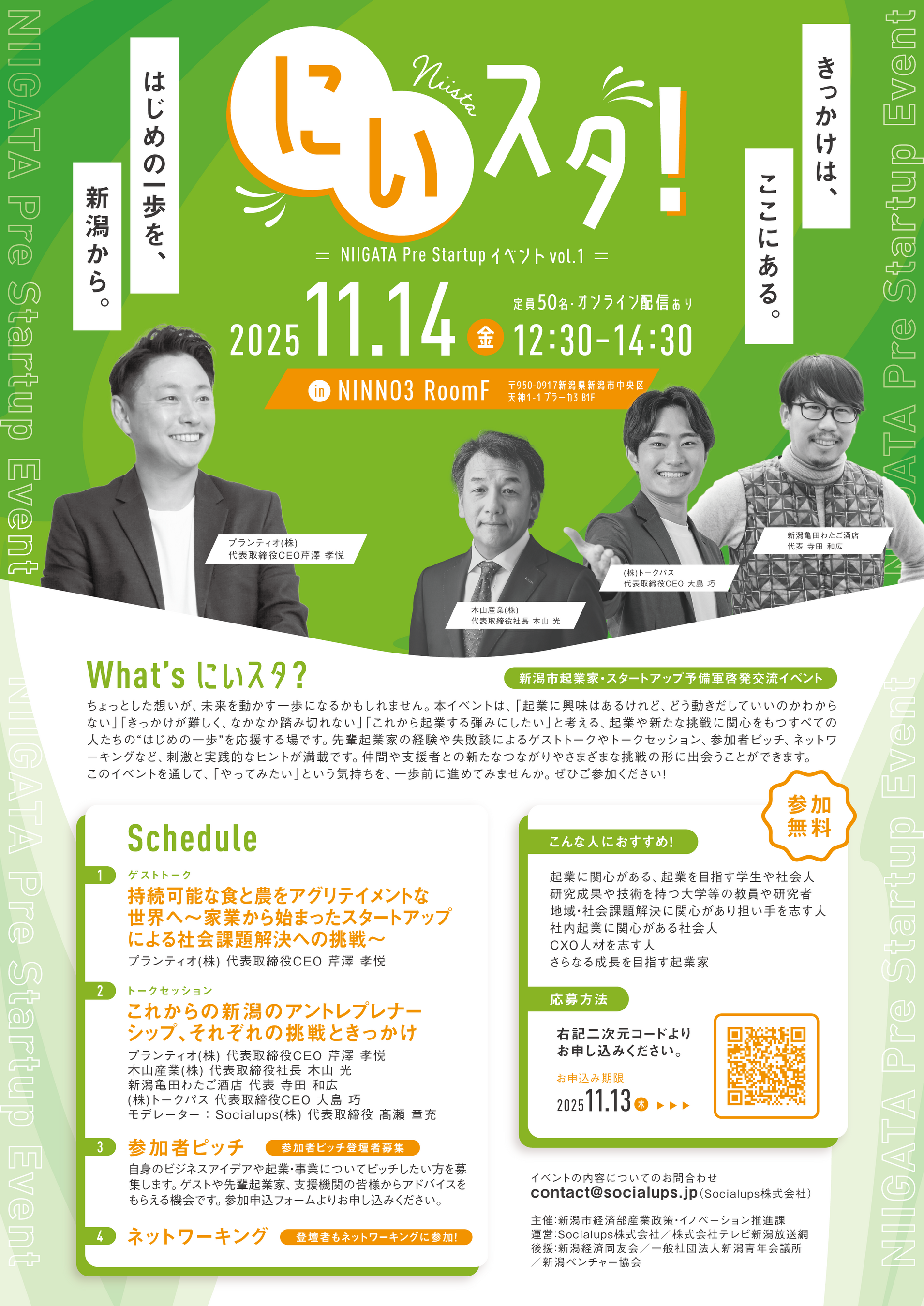 起業家支援・新規事業創出を手がけるSocialups株式会社(本社:新潟市中央区、代表取締役社長:髙瀬章充 以下、当社)は、このたび新潟市主催の起業家・スタートアップ予備軍啓発交流イベント「にいスタ! NIIGATA Pre Startup イベントVol.1~きっかけは、ここにある。はじめの一歩を新潟から。~」を開催・運営します。