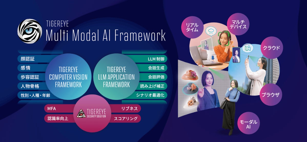 これらの要素は、TIGEREYEのマルチモーダルAIプラットフォームの中核を成し、顔パスファミリーやAIアバター、ONEFACEなどのサービスに組み込まれ、視覚・音声・言語の統合による高度なAIソリューションを提供します。このプラットフォームは、リアルタイムでの高精度な処理を実現するAI as a Service (AIaaS) として提供します。
