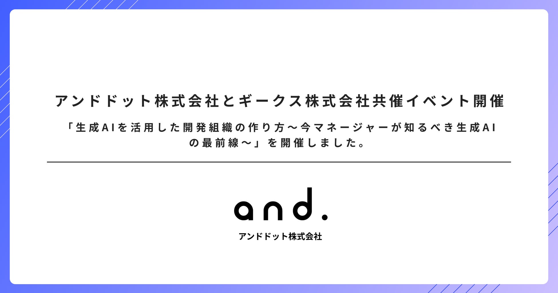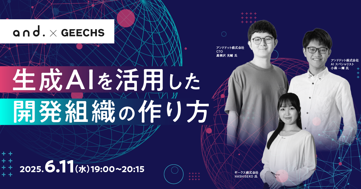 アンドドット株式会社(本社:東京都渋谷区、代表:茨木 雄太、以下アンドドット)は、ギークス株式会社(本社:東京都渋谷区、代表取締役CEO:曽根原 稔人、以下ギークス)と共催で、2025年6月11日(水)19:00~20:15にてエンジニア・エンジニア採用担当者向けの無料セミナー「生成AIを活用した開発組織の作り方~今マネージャーが知るべき生成AIの最前線~」を開催しました。
