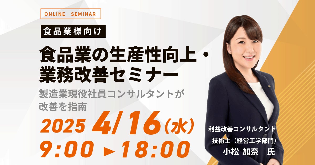 時間管理や業務効率化、原価管理など、食品業の業務改善の具体的な手法について、利益改善コンサルタント 技術士(経営工学部門) 小松 加奈 氏が解説します。