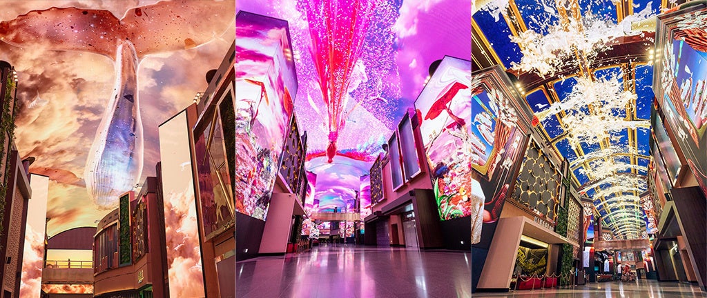 オーロラは、150メートルに及ぶ天井と26メートルの柱を覆う超高解像度LEDサイネージを駆使し、22Kの超高解像度の天井メディアと8Kの柱メディアを組み合わせた比類ない没入感を実現している没入型デジタル・エンターテインメント・ストリートで、大規模な3Dコンテンツが生き生きと映し出されています。