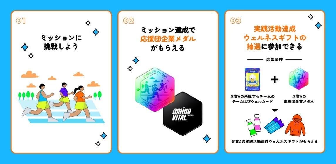 応援団企業メダル」と、その企業が属するチームの「チームはぴウェルカード」をそろえると、「実践活動達成ウェルネスギフト」の抽選に参加できます。
