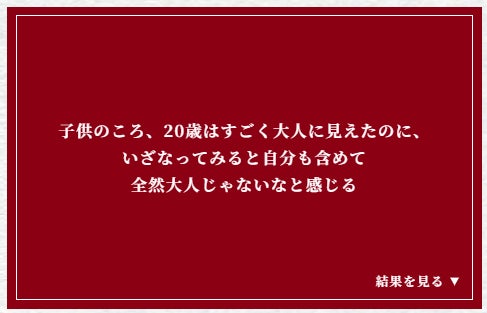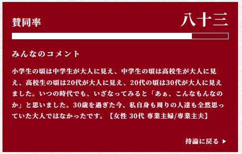 持論の一つ 「子供のころ、20歳はすごく大人に見えたのに、いざなってみると自分も含めて全然大人じゃないなと感じる」は、非常に共感度が高く、賛同者からのコメントでは「小学生の頃は中学生が大人に見え、中学生の頃は高校生が大人に見え、高校生の頃は20代が大人に見え、20代の頃は30代が大人に見えました。いつの時代でも、いざなってみると「あぁ、こんなもんなのか」と思いました。」と寄せられています。何歳になっても感じ方は同じなのかもしれません。