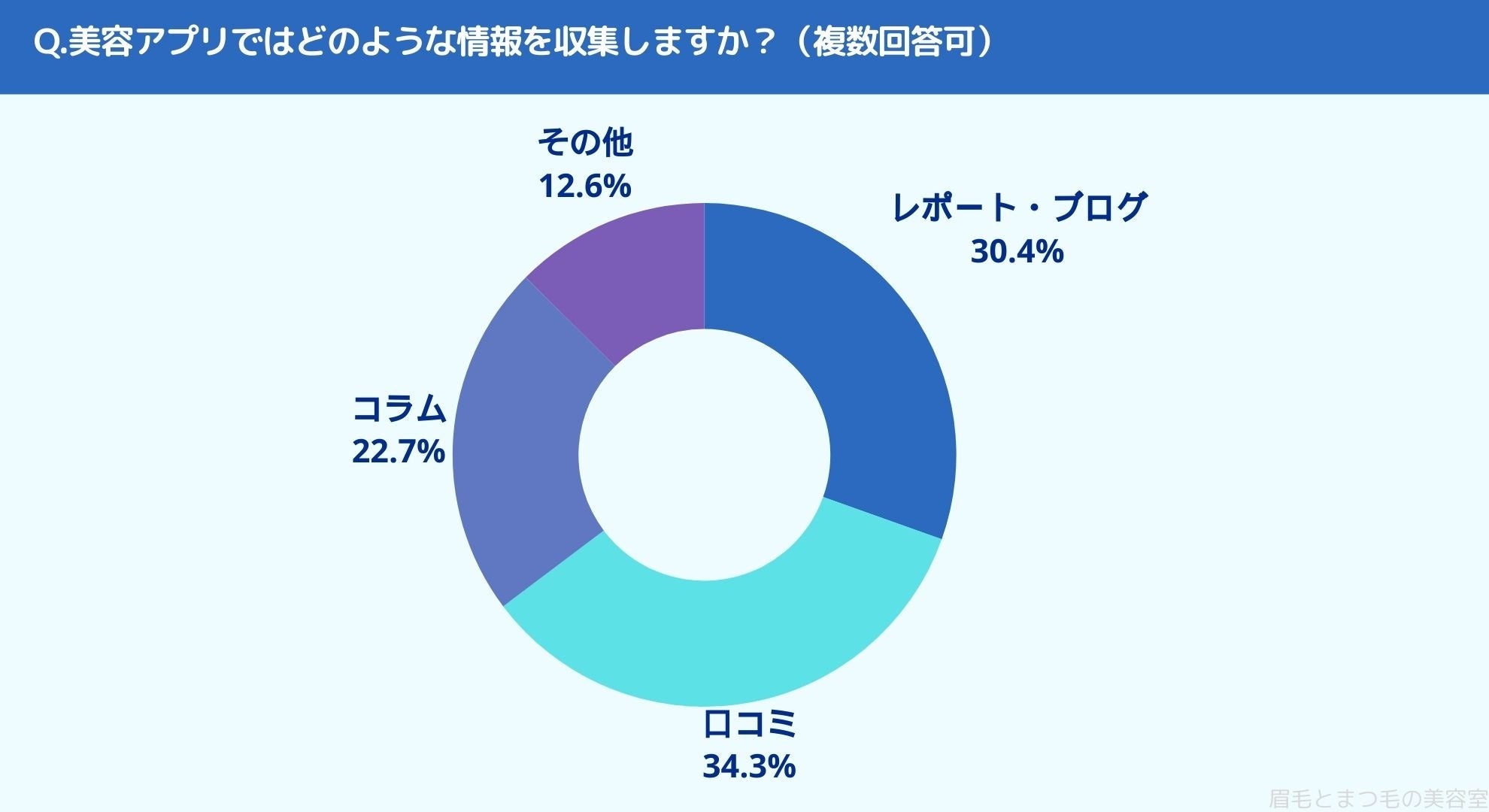 美容系アプリでどのような情報を収集しているかお尋ねしたところ「レポート・ブログ(30.4%)」、「口コミ(34.3%)」、「コラム(22.7%)」、「その他(12.6%)」という結果になりました。
